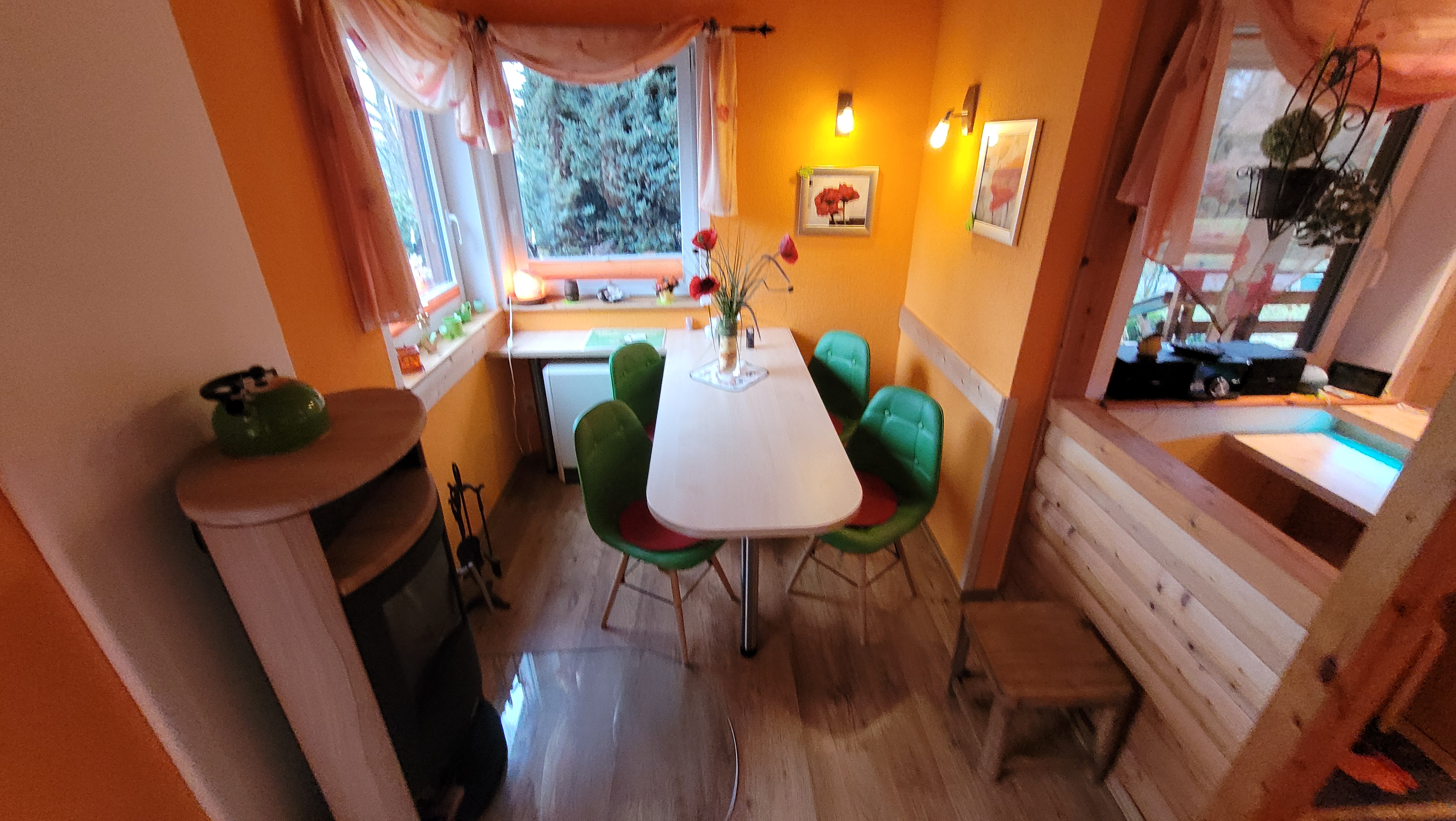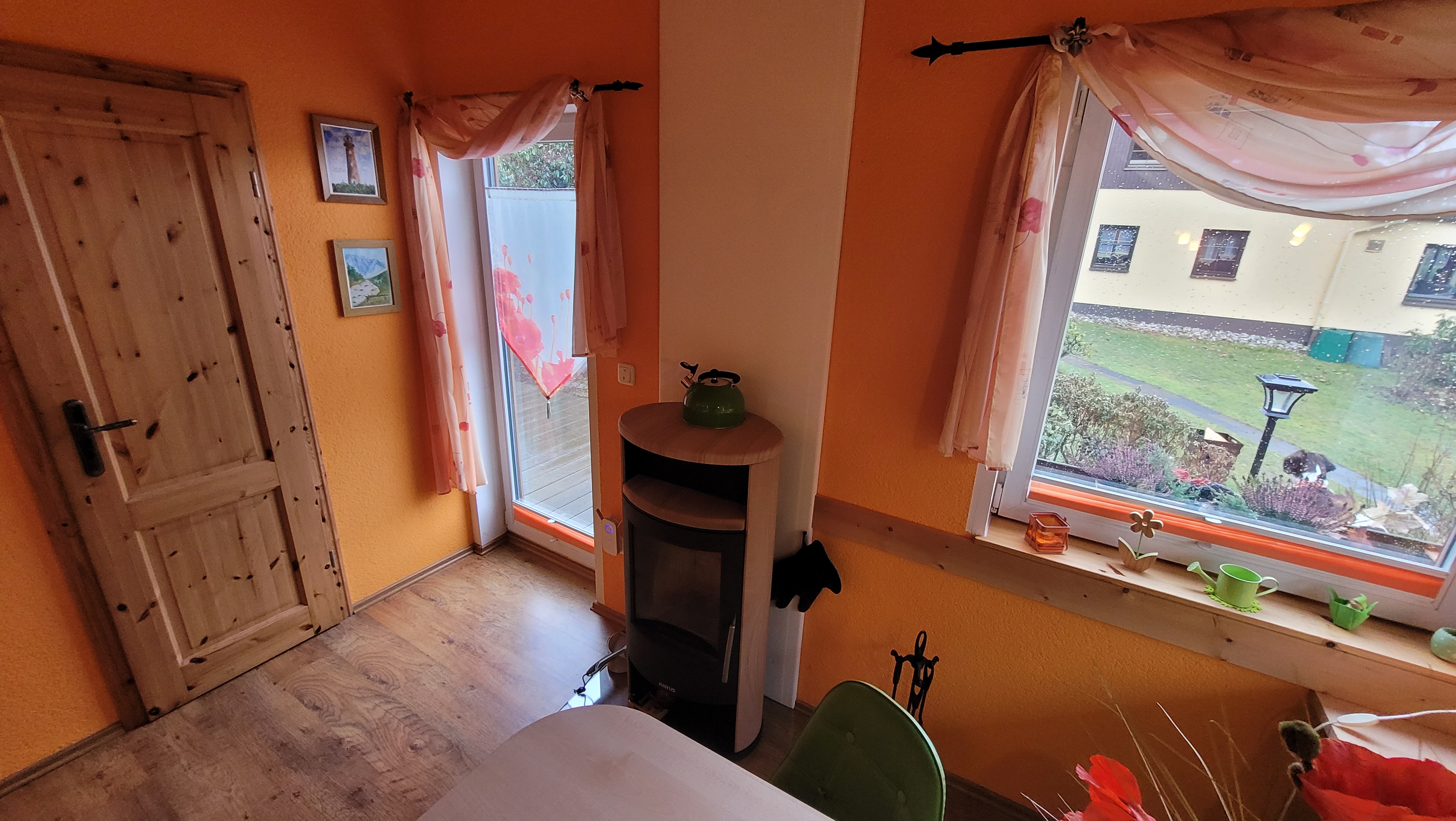 Eßplatz für 4 Personen mit Kaminofen und Ausgang auf große Sonnenterrasse