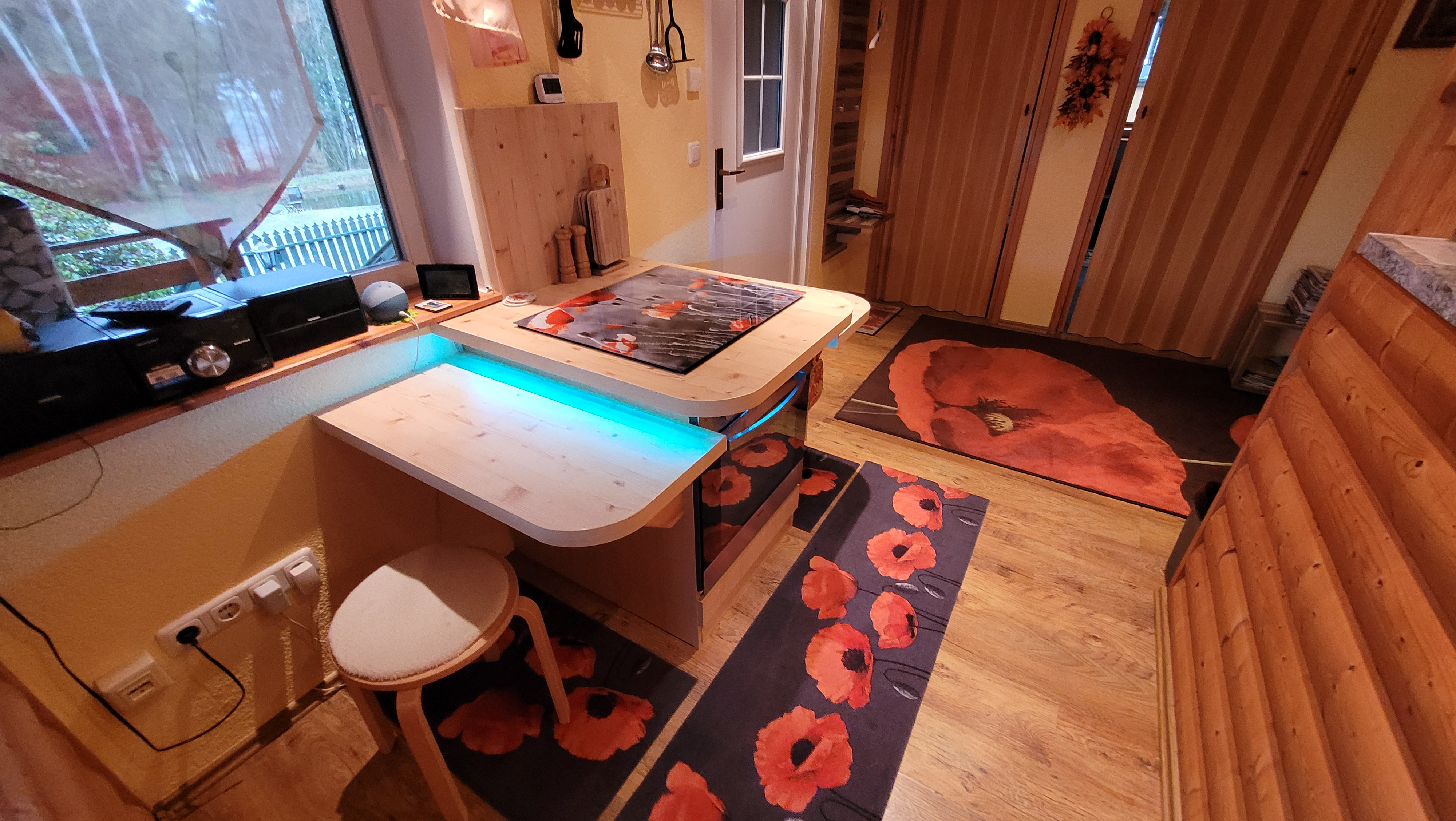 Eine sehr gemütliche komplett eingerichtete Küche mit Raumteiler, separatem Kochblock mit zwei Sitzplätzen