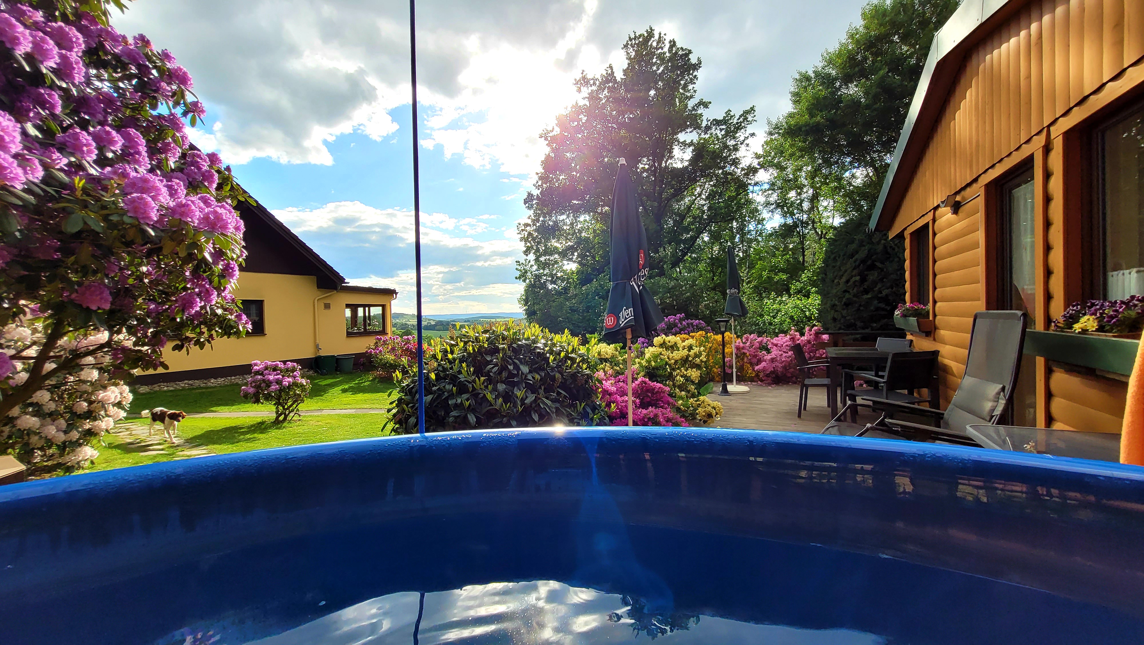 Anschließend relaxen Sie auf bequemen Liegen auf unserer großen Sonnenterrasse, welche Sie direkt vom Relaxraum erreichen können. Ein entspannendes Luft- und Whirlsprudelbad in unserem grossen, neuen HOT - TUBE, können Sie bei einem Gläschen Wein oder einem Bierchen mit Fernblick über das Vogtland gemeinsam bis in den Abend hinein, geniessen.