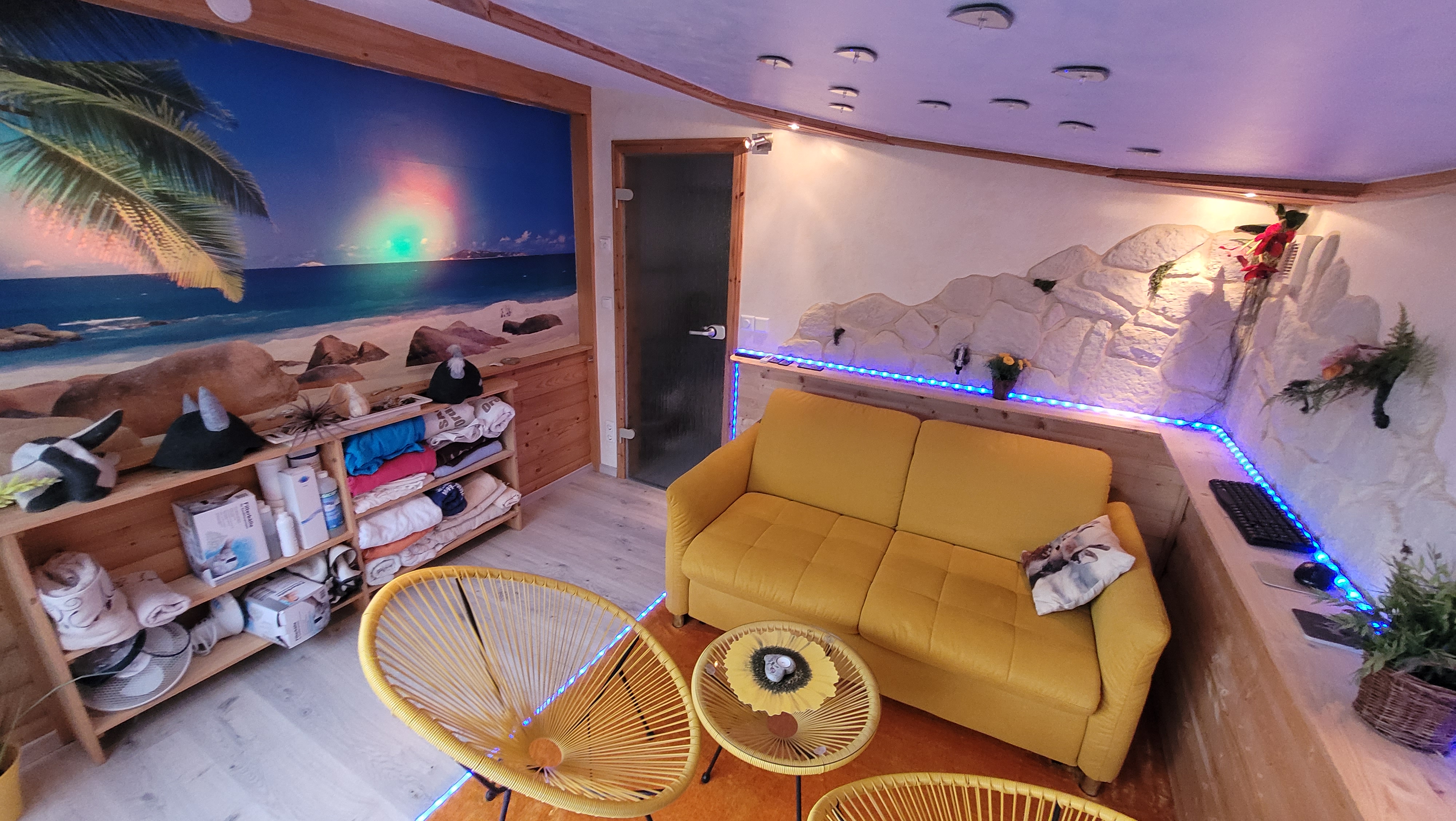 Der, RELAX - Raum im karibisch gestalteten Flair, beinhaltet ein großes Schlafsofa als sehr bequemes Doppelbettsofa für 2 Personen mit einer interessanten Lichtgestaltung und einem Flatscreen, auf welchem Sie über You-Tube, Netflix etc. sich einen abwechslungsreichen Tag selbst gestalten können.