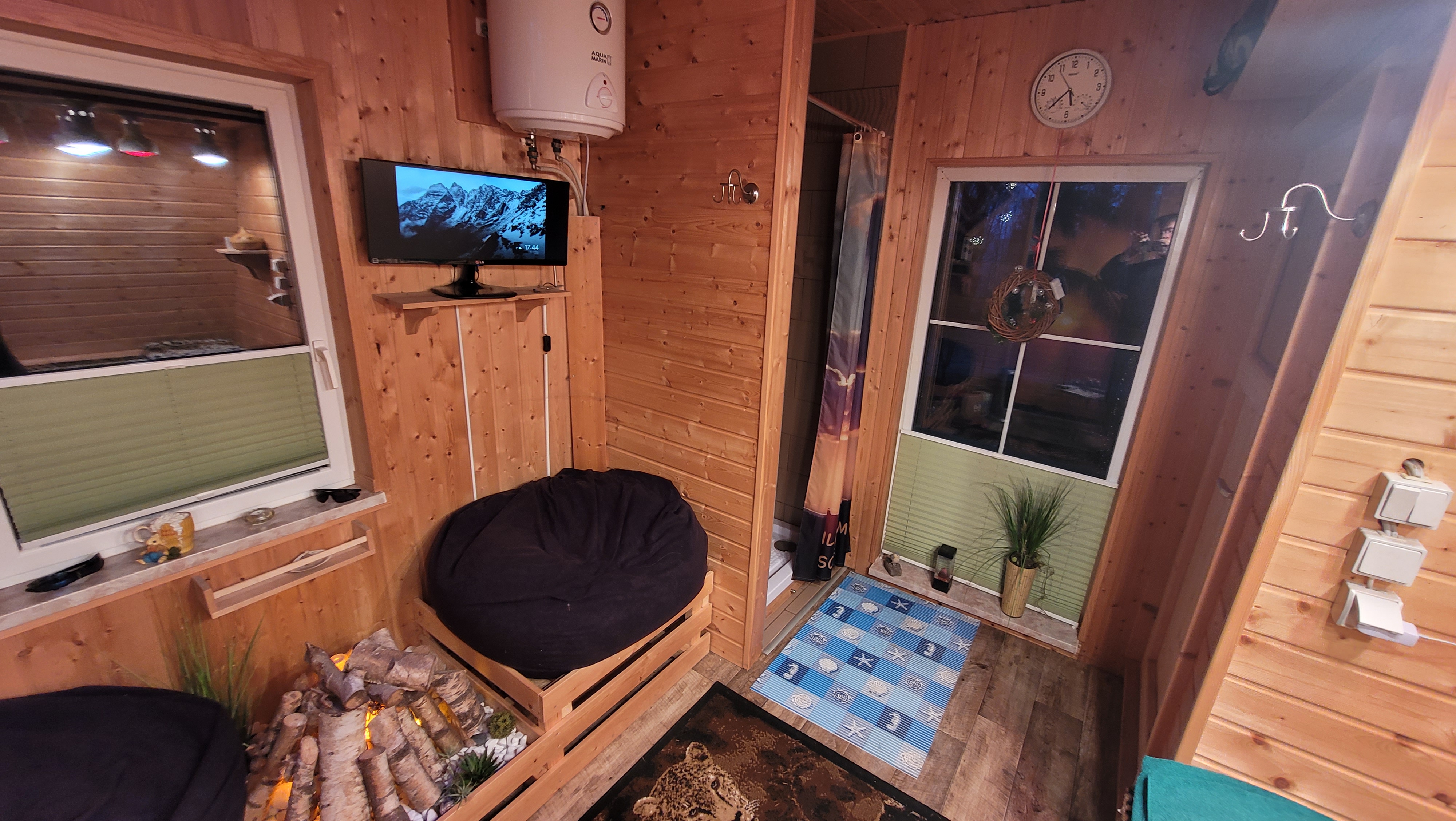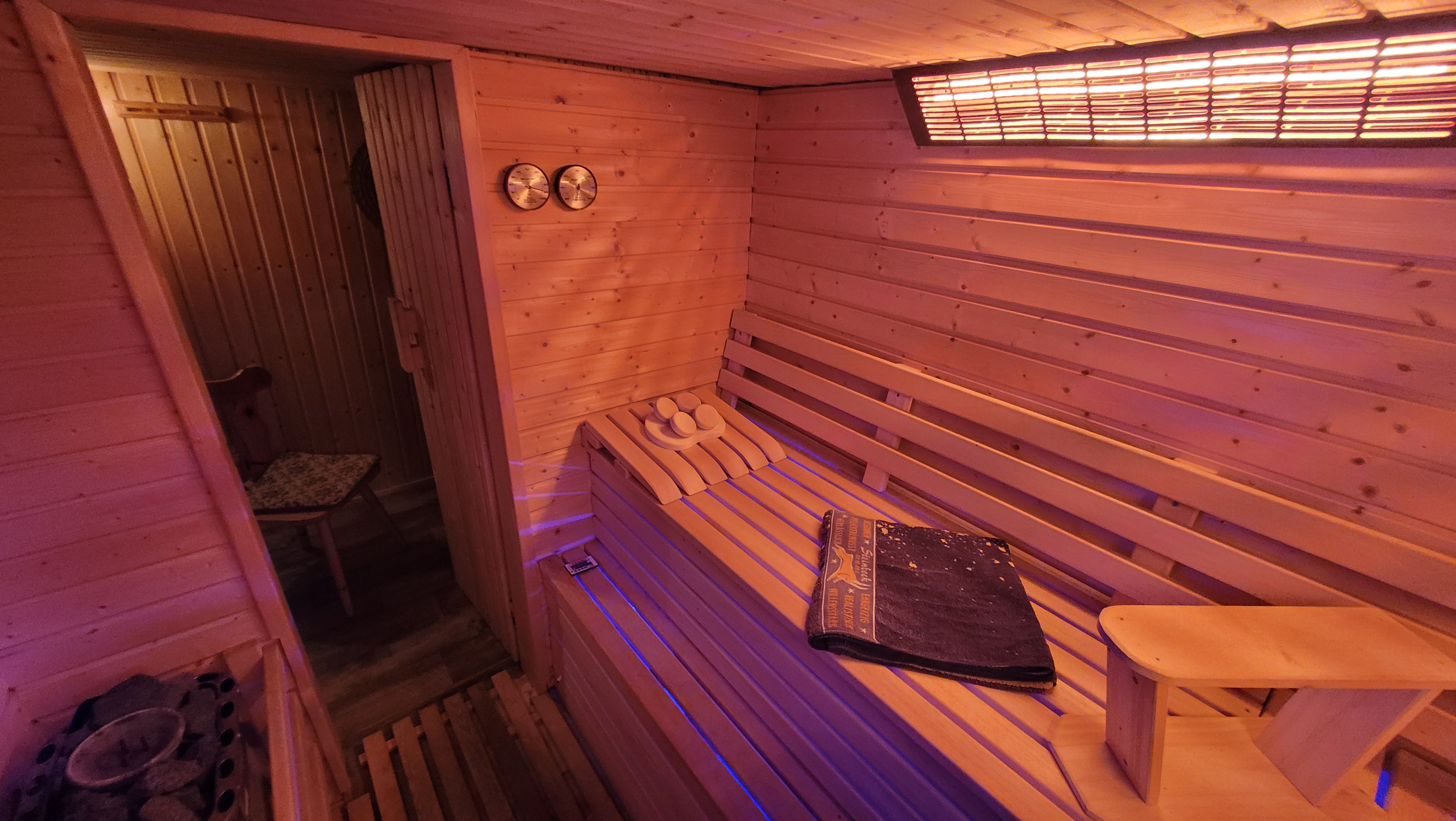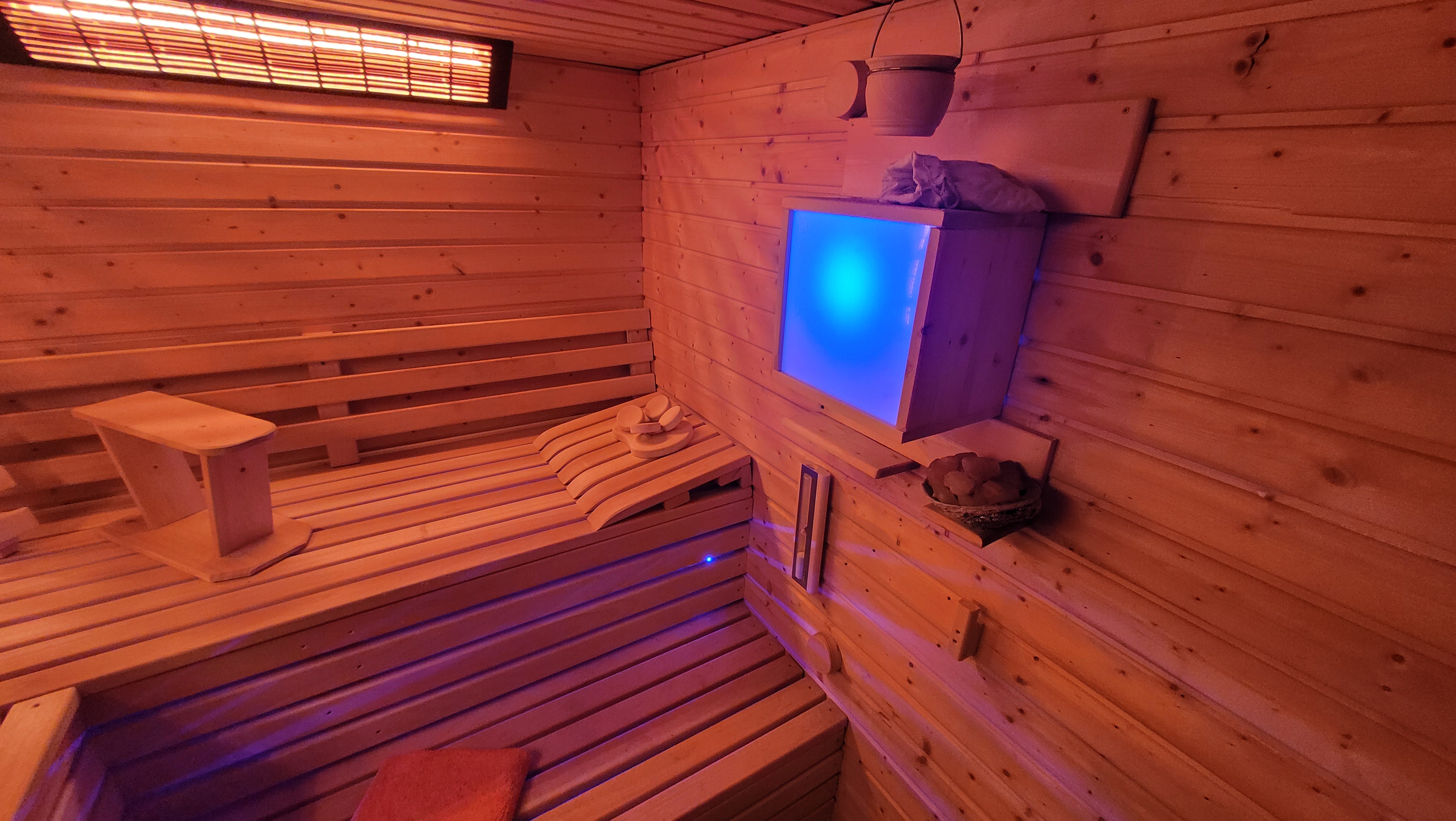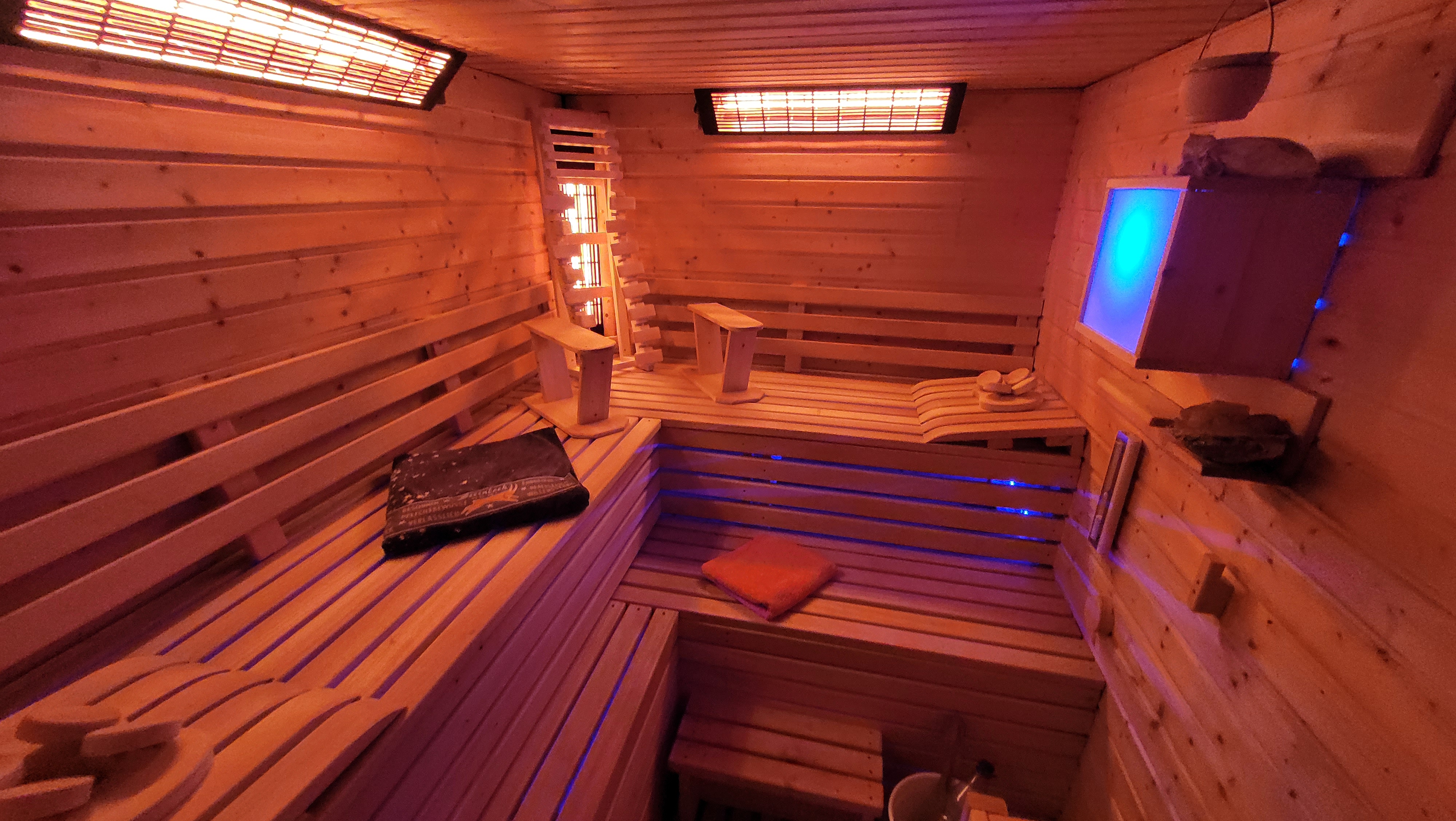 Blick auf Wellnessbereich Waldsauna mit Infrarotkabine SONNENHAUS