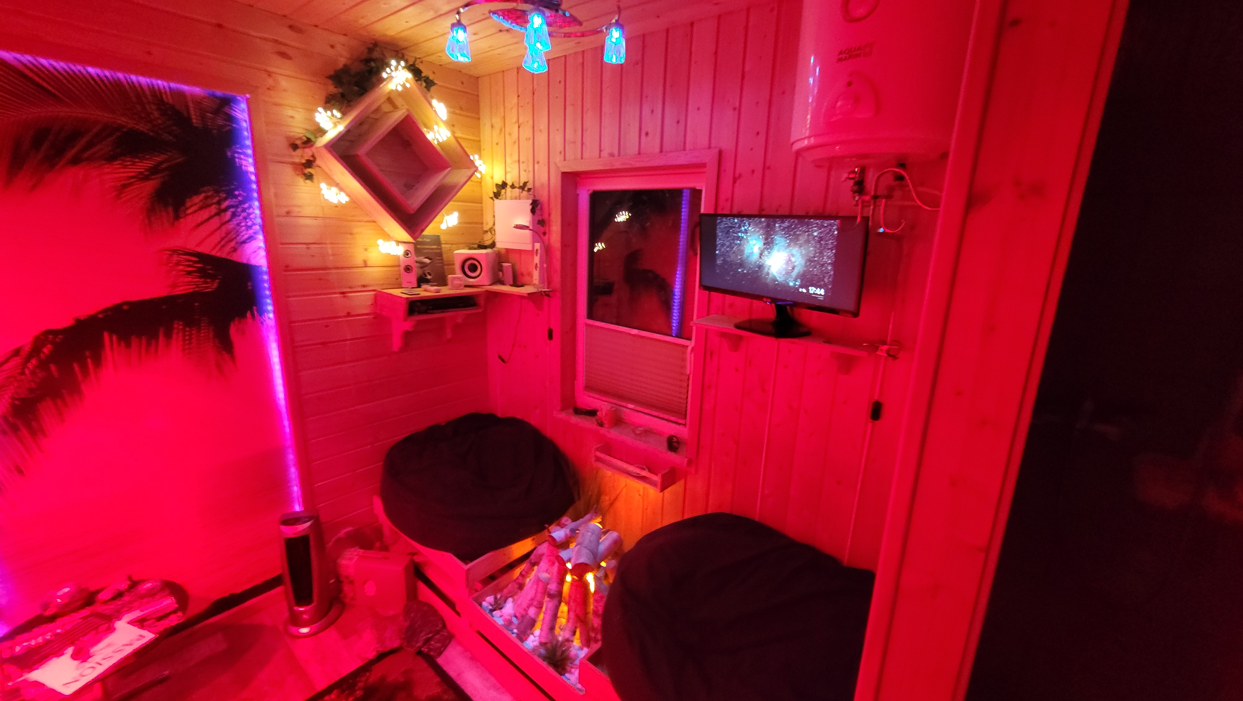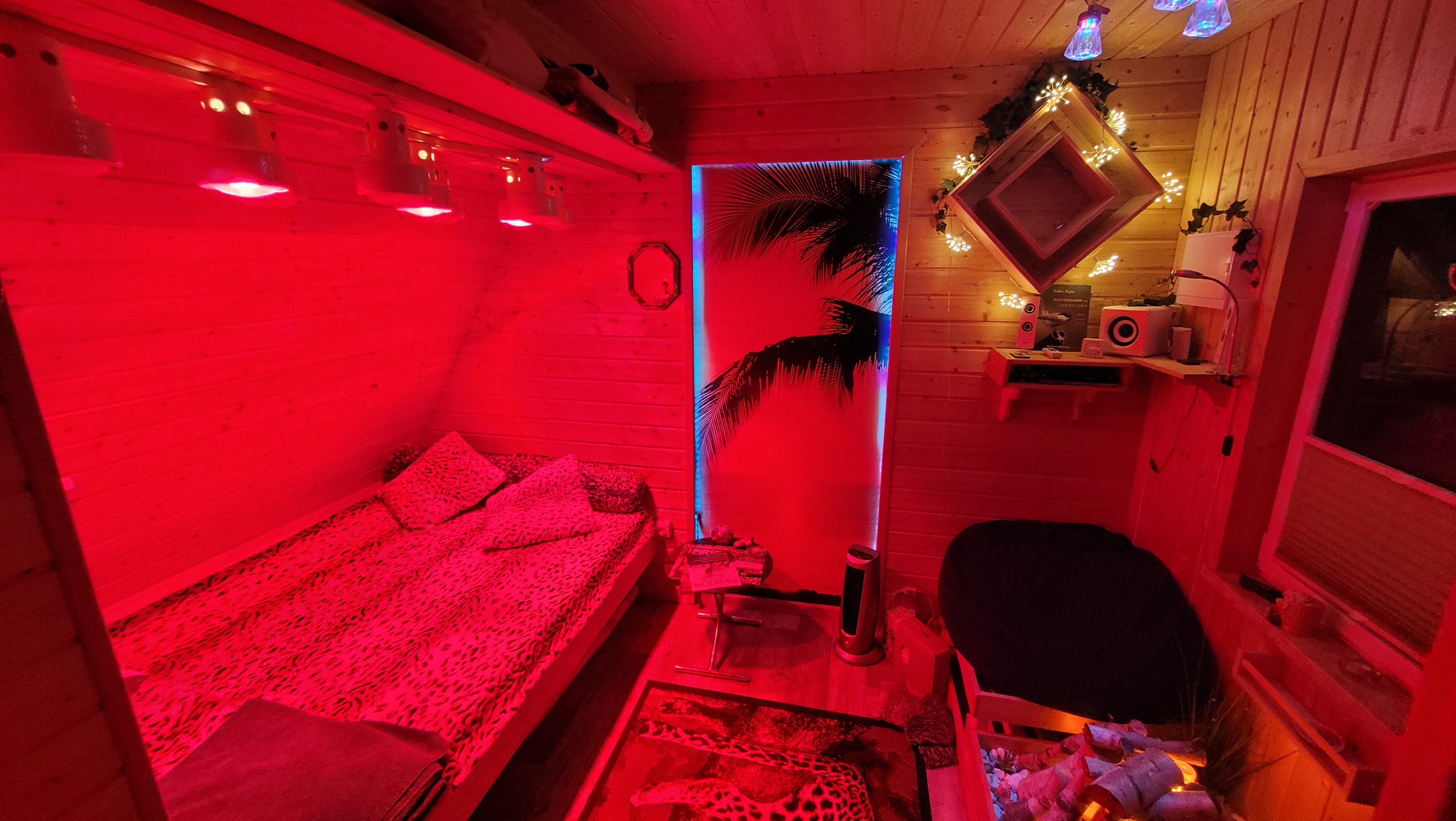 - Sonnenhaus mit einer WEINSBERGER-Sonne (keine Sonnenbank), sondern einer sehr natürlichen Sonnenstrahlung nahekommend ohne schädliche bekannte Strahlungseinwirkung der ultravioletten Strahlung und drei Rotlichtstrahlern. Hier finden Sie weiterhin eine Liegefläche für zwei Personen, eine Dusche und eine bequeme Sitzecke mit stilisiertem Lagerfeuer.